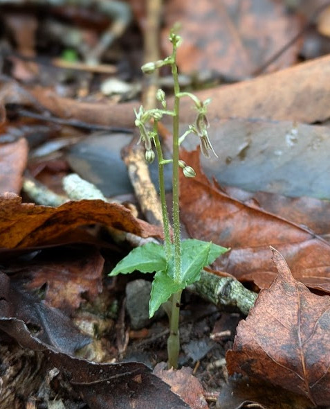 先月から地中から双葉を出して蕾を見せていたヒメフタバランが咲き始めていました。高さ3cmほどの小さなランです。