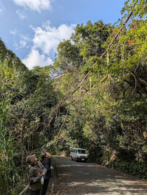 この写真の右上に1枚目の写真のモダマの豆果があります。それを道路から見上げているところです。