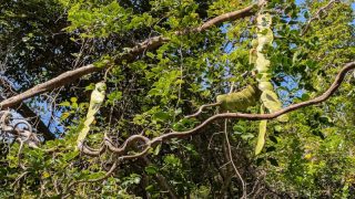 モダマの豆果 1月11日にマングローブカヌーツアーへ行った帰り道にモダマの群生地へ立ち寄ってみました。 住用町の東仲間集落から三太郎峠へ登り始めて最初のカーブに、モダマの案内に看板があるのですが、その手前で頭上にモダマの豆果がつるにぶらさが...